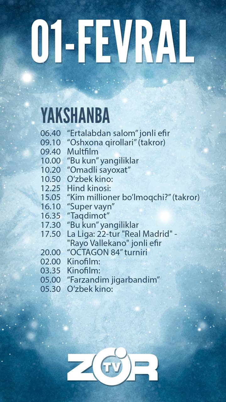 Zo'r TV телеканали бугун — 2026 йил 1-февраль, якшанба куни қуйидаги кўрсатув ва трансляцияларни эфирга узатишни режалаштирган.