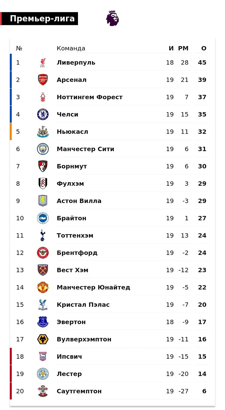 Londonliklar Angliya chempionatida 39 ochko jamg‘arib, ikkinchi pog‘onani band etishdi. "Kanonirlar" "Liverpul"dan oldinda, mersisaydliklar 6 ochko ko‘proq to‘plagan va bir o‘yin zaxirasiga ega.