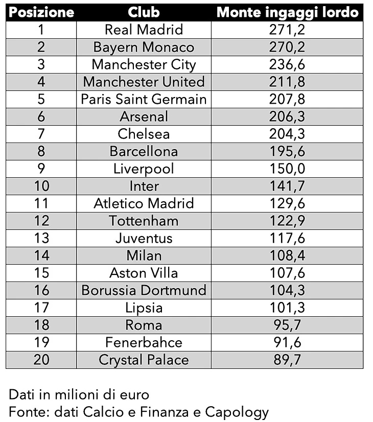 Italiyalik jurnalistlar 2024/25 yilgi mavsumda soliqqa tortilgunga qadar o‘yinchilarning maoshlariga boshqalarga qaraganda ko‘proq mablag‘ sarflayotgan Yevropaning top 20ta klubi ro‘yxatini tuzib chiqdi.
