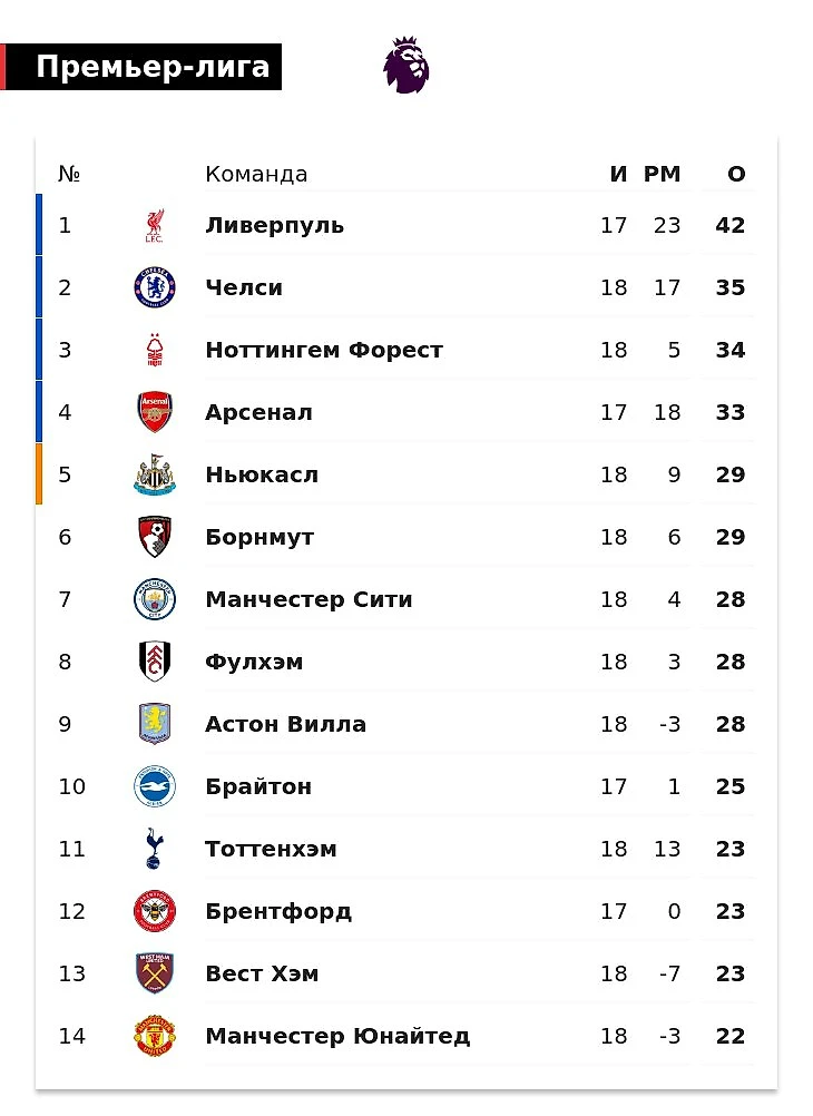 "Qizillar" 17 uchrashuvdan so‘ng 42 ochko bilan turnir jadvalida birinchi o‘rinda bormoqda. Ular "Chelsi"dan yetti ochko, "Nottingem Forest"dan sakkiz ochko oldinda.
