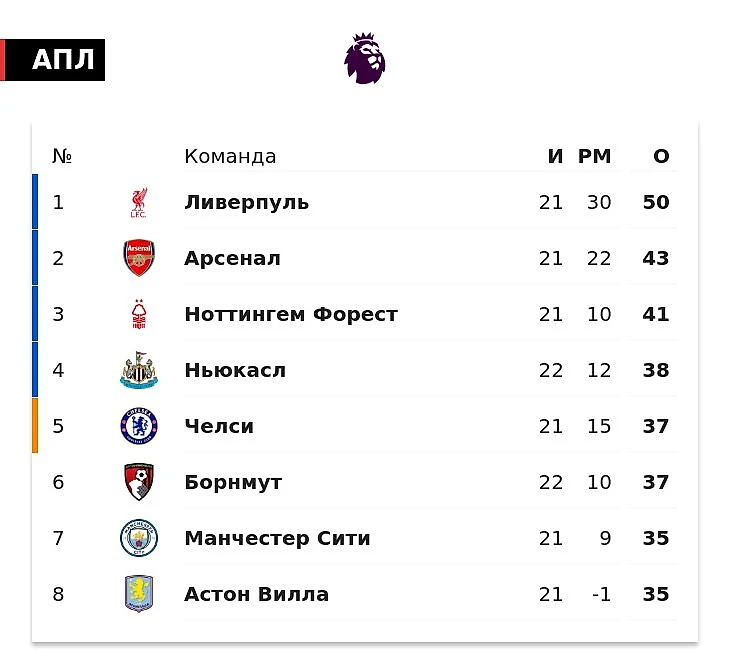 "Qizillar" 50 ochko to‘plab, jadvalda yetakchilik qilmoqda. "Arsenal" 43 ochko bilan ikkinchi, "Nottingem Forest" 41 ochko bilan uchinchi o‘rinda bormoqda. Hozirda to‘rtinchi o‘rinni "Nyukasl" egallab turibdi, u 38 ochkoga ega.