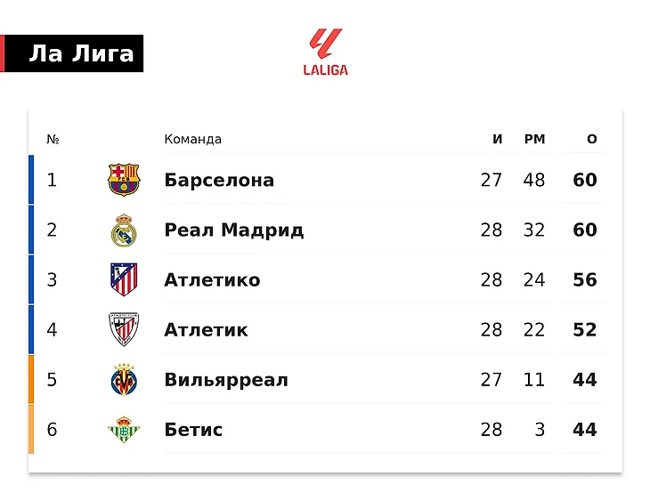 Kataloniyaliklar hisobida "Real"niki kabi 60 ochko bor, biroq ular qo‘shimcha ko‘rsatkichlar bo‘yicha oldinda va buning ustiga zaxira o‘yiniga ega.