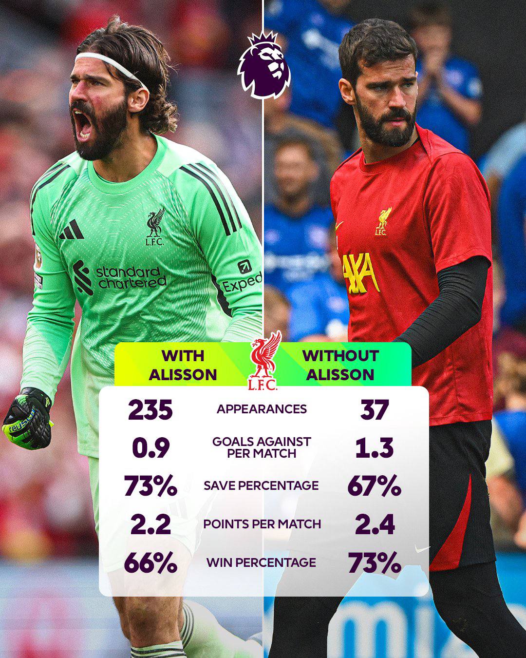 Premier-league statistics xabariga ko‘ra, "qizillar" Alisson bilan o‘tkazgan 235 ta o‘yinning 66 foizini g‘alaba bilan yakunlagan. Usiz o‘tgan 37 ta o‘yinda g‘alaba foizi 73 ni tashkil qiladi.