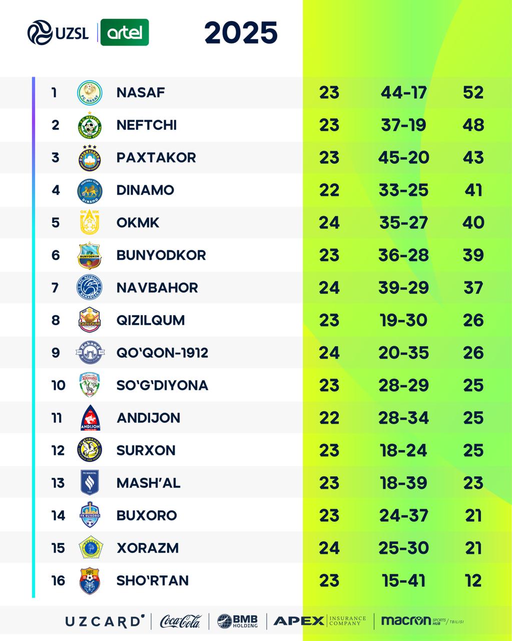 Superligada 24-tur start oldi: Bugungi o‘yinlardan so‘ng turnir jadvali (foto)