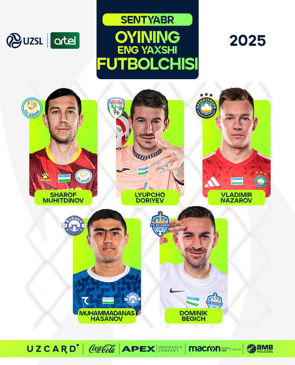 O‘zPFL rasmiy telegram-kanali Superligada sentyabr oyining eng yaxshi futbolchisi bo‘lish uchun nomzodlar ro‘yxatini taqdim etdi.