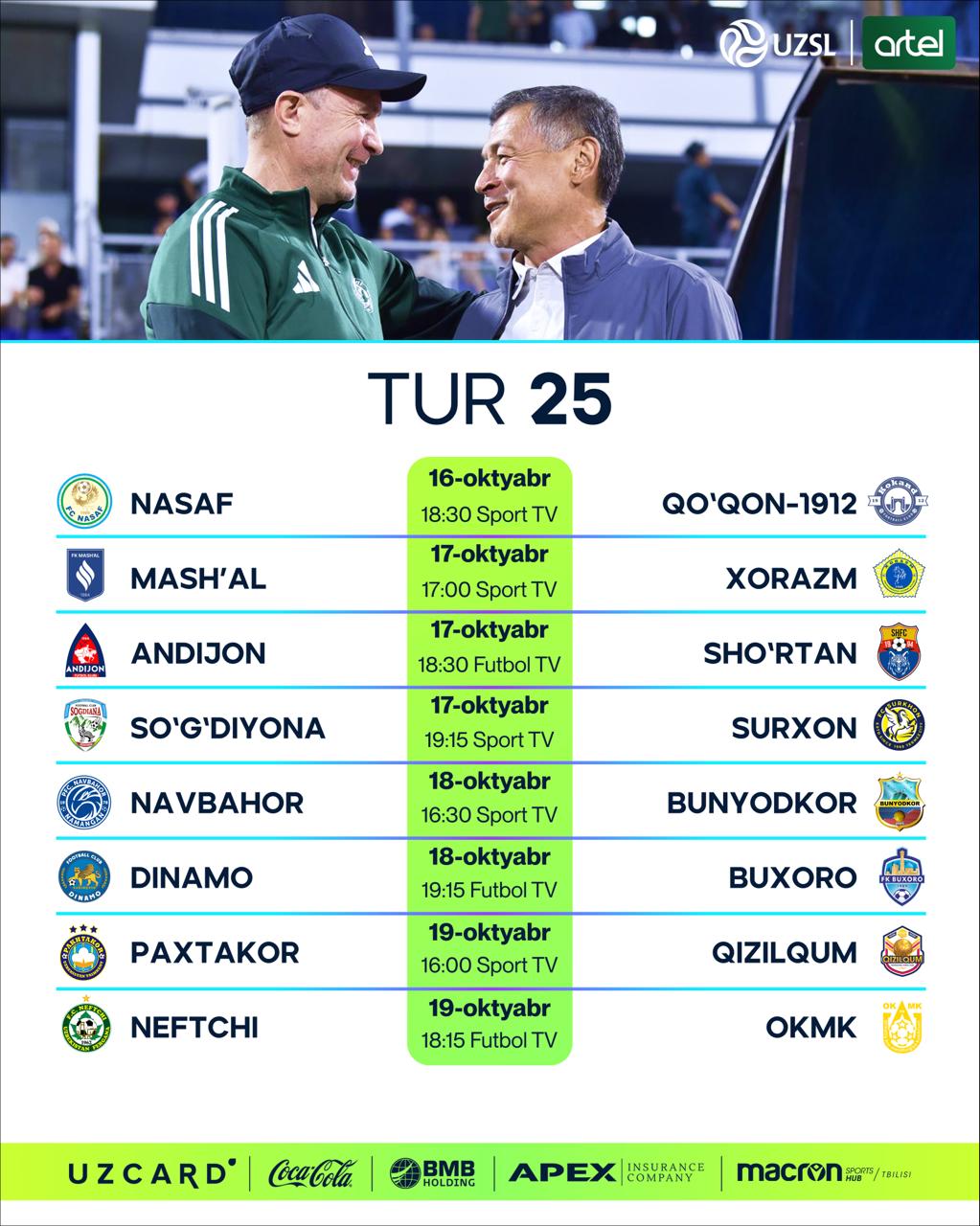 O‘zPFL rasmiy telegram-kanali 16-19 oktyabr kunlari o‘tkaziladigan 25-tur o‘yinlarining boshlanish vaqtlarini e’lon qildi.