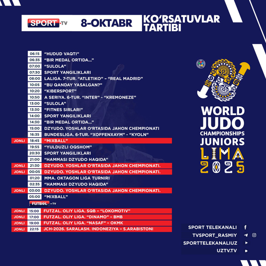 Sport va Futbol telekanallari bugun — 2025 yil 8-oktyabr, chorshanba kuni quyidagi ko‘rsatuv va translyasiyalarni efirga uzatishni rejalashtirgan.