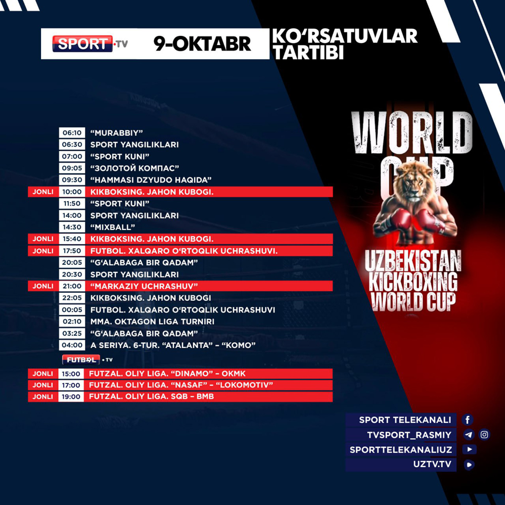 Sport va Futbol telekanallari bugun — 2025 yil 9-oktyabr, payshanba kuni quyidagi ko‘rsatuv va translyasiyalarni efirga uzatishni rejalashtirgan.
