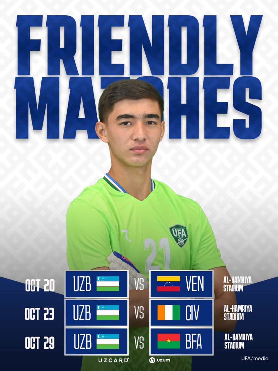 Islombek Ismoilov boshqaruvidagi jamoamiz yig‘in doirasida U-17 Jahon chempionati ishtirokchilari — Venesuela, Kot-d'Ivuar va Burkina-Fasoga qarshi o‘rtoqlik uchrashuvlarida maydonga tushadi. Bahslar "Al-Hamriya" stadionida bo‘lib o‘tadi.