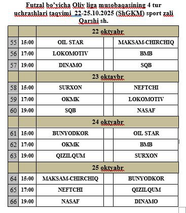 Futzal bo‘yicha mamlakat milliy chempionati — Oliy liga jamoalarining 4-tur uchrashuvlari shu yilning 22–25 oktyabr sanalarida Qarshi shahrida bo‘lib o‘tadi. Turga «Geolog» sport majmuasi mezbonlik qiladi.