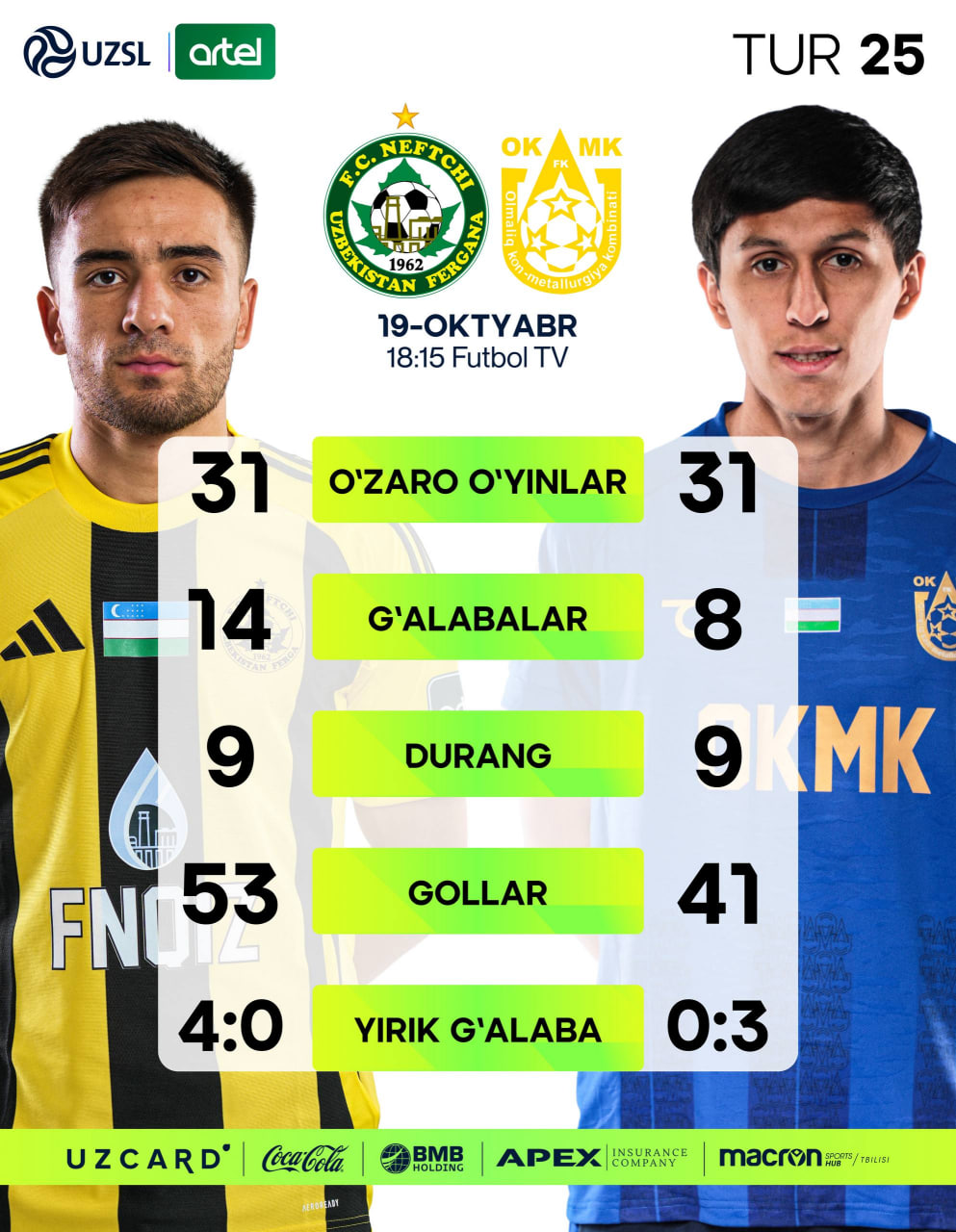 O‘yindan oldin jamoalarning o‘zaro uchrashuvlardagi statistikasi bilan tanishing.