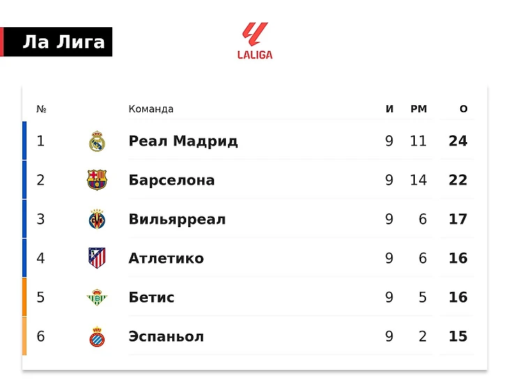 Uchinchi o‘rinda "Vilyarreal" (17 ochko), to‘rtinchi o‘rinda "Atletiko" (16).