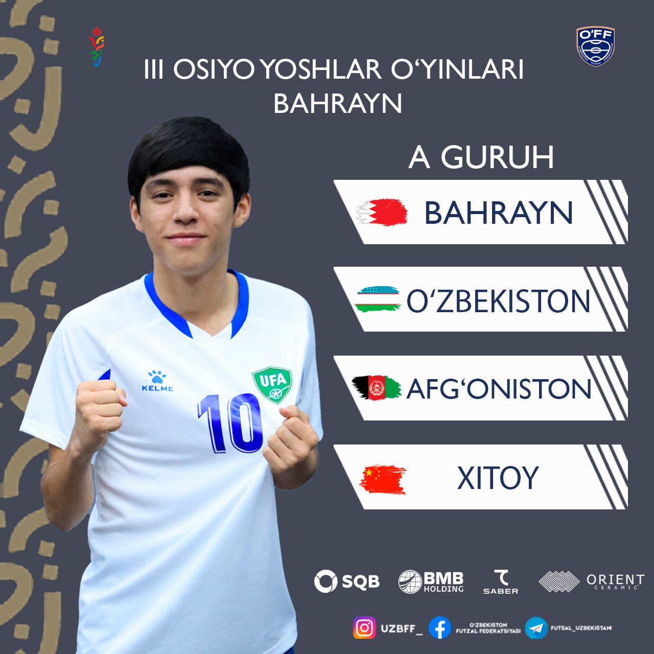 Osiyo o‘yinlarining futzal turida mamlakatimiz sharafini himoya etadigan O‘zbekiston o‘smirlar terma jamoasi “A” guruhida musobaqa mezboni — Bahrayn, shuningdek, Afg‘oniston hamda Xitoy terma jamoalariga qarshi maydonga chiqadi. Dastlabki uchrashuv 24 oktyabr sanasida Afg‘oniston terma jamoasiga qarshi bo‘lib o‘tadi.