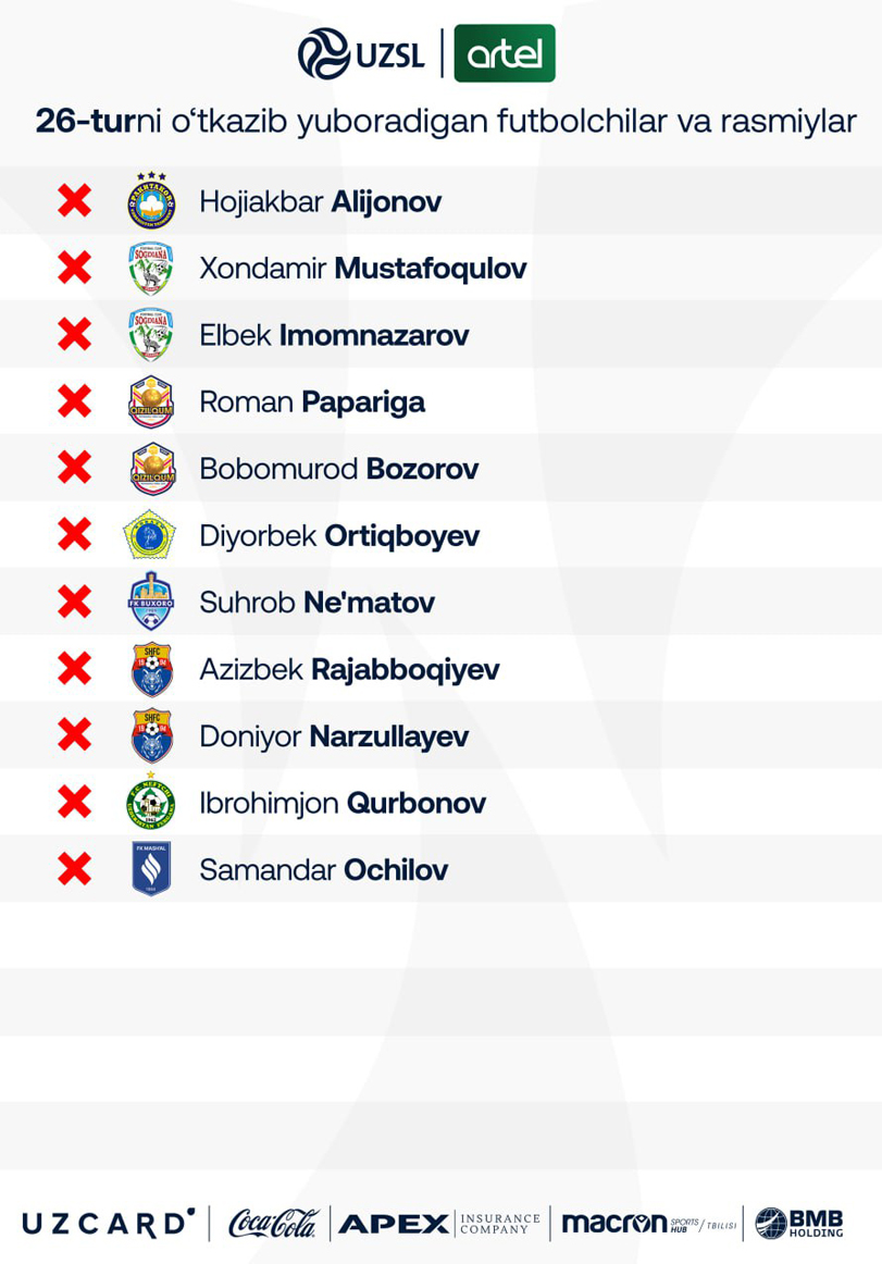 O‘zPFL matbuot xizmati Superliganing 26-turida maydonga tusha olmaydigan futbolchilar ro‘yxatini e’lon qildi.