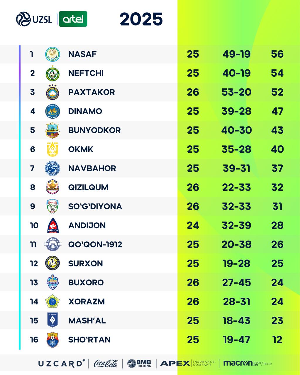 Superliga. Bugungi o‘yindan so‘ng turnir jadvalidagi holat bilan tanishing (foto)