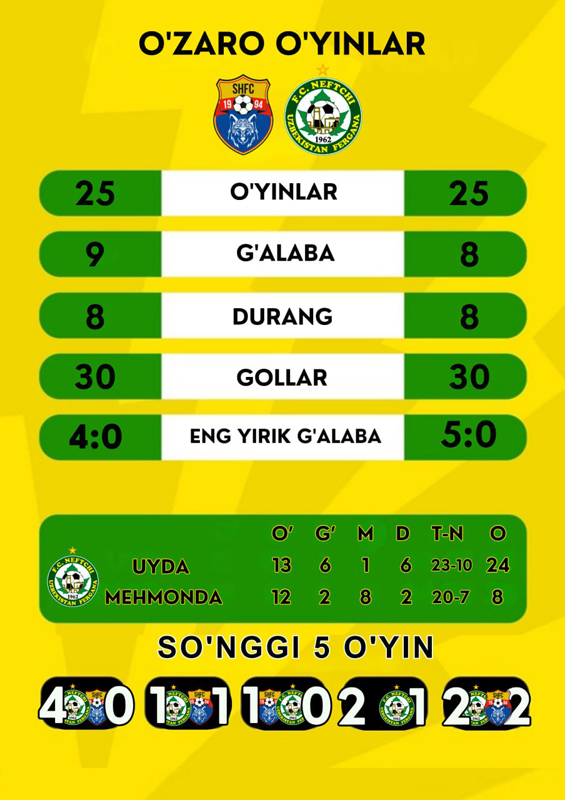 G‘uzorda bo‘lib o‘tgan so‘nggi 5 uchrashuv natijalari quyidagicha:
