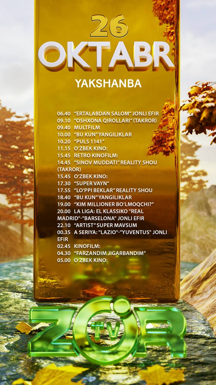 Zo'r TV telekanali bugun — 2025 yil 26-oktyabr, yakshanba kuni quyidagi ko‘rsatuv va translyasiyalarni efirga uzatishni rejalashtirgan.
