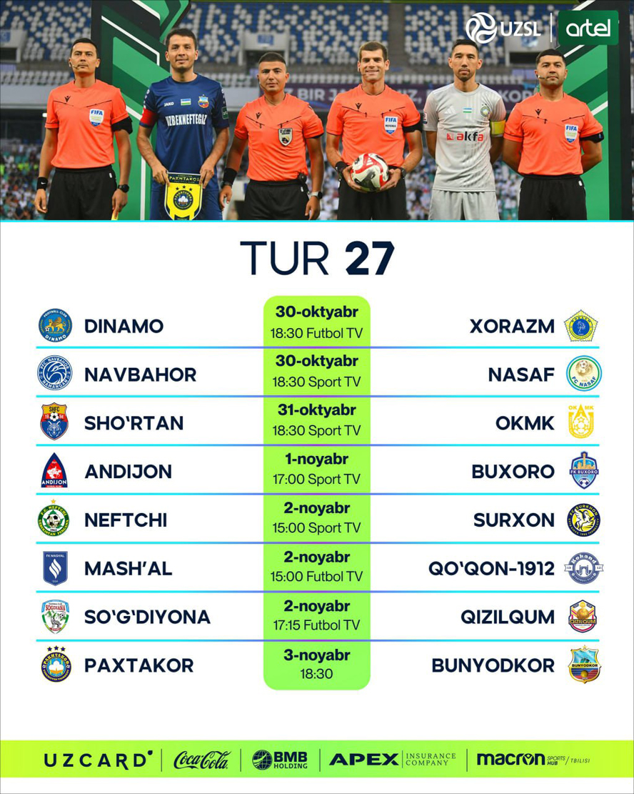 O‘zPFL matbuot xizmati Superliganing 27-tur o‘yinlari boshlanish vaqtlarini e’lon qildi.