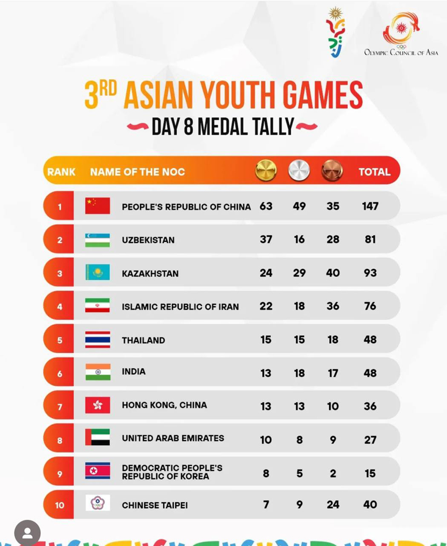 Ushbu natijaning tarixiyligi shundaki, delegasiyamiz I Osiyo yoshlar o‘yinlarida 3 ta bronza, II O‘yinlarda esa 1 ta oltin, 2 ta kumush va 3 ta bronza medallarini qo‘lga kiritgan bo‘lsa, bu gal mazkur raqamlar ancha salmoqli ko‘rinish oldi.