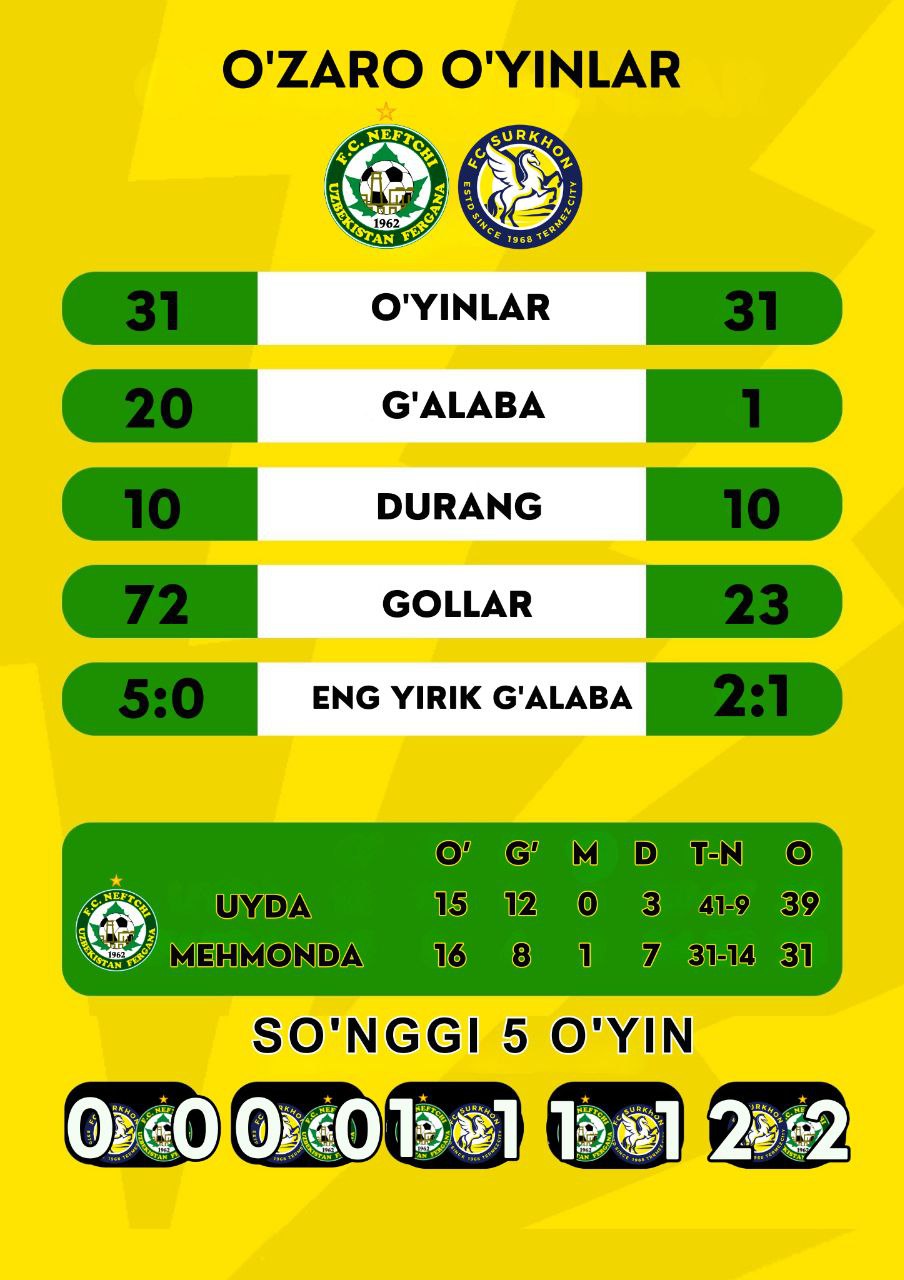 Statistikaga nazar tashlaymiz. "Neftchi" jamoasi "Surxon" klubi bilan milliy chempionatimiz doirasida o‘zaro 31 marta to‘qnashgan bo‘lib, bundan 20 tasida farg‘onaliklarning qo‘li baland kelgan bo‘lsa, 10 ta o‘yinda jamoalar murosa ko‘chasini tanlashgan va faqat bitta bellashuvda "Surxon" jamoasi g‘alaba qozonishga muvaffaq bo‘lgan.