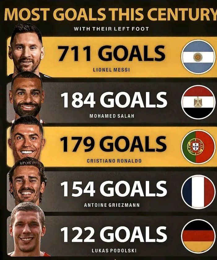 Quyida chap oyoqda eng ko‘p gol urgan futbolchilar ro‘yxati bilan tanishib chiqing.