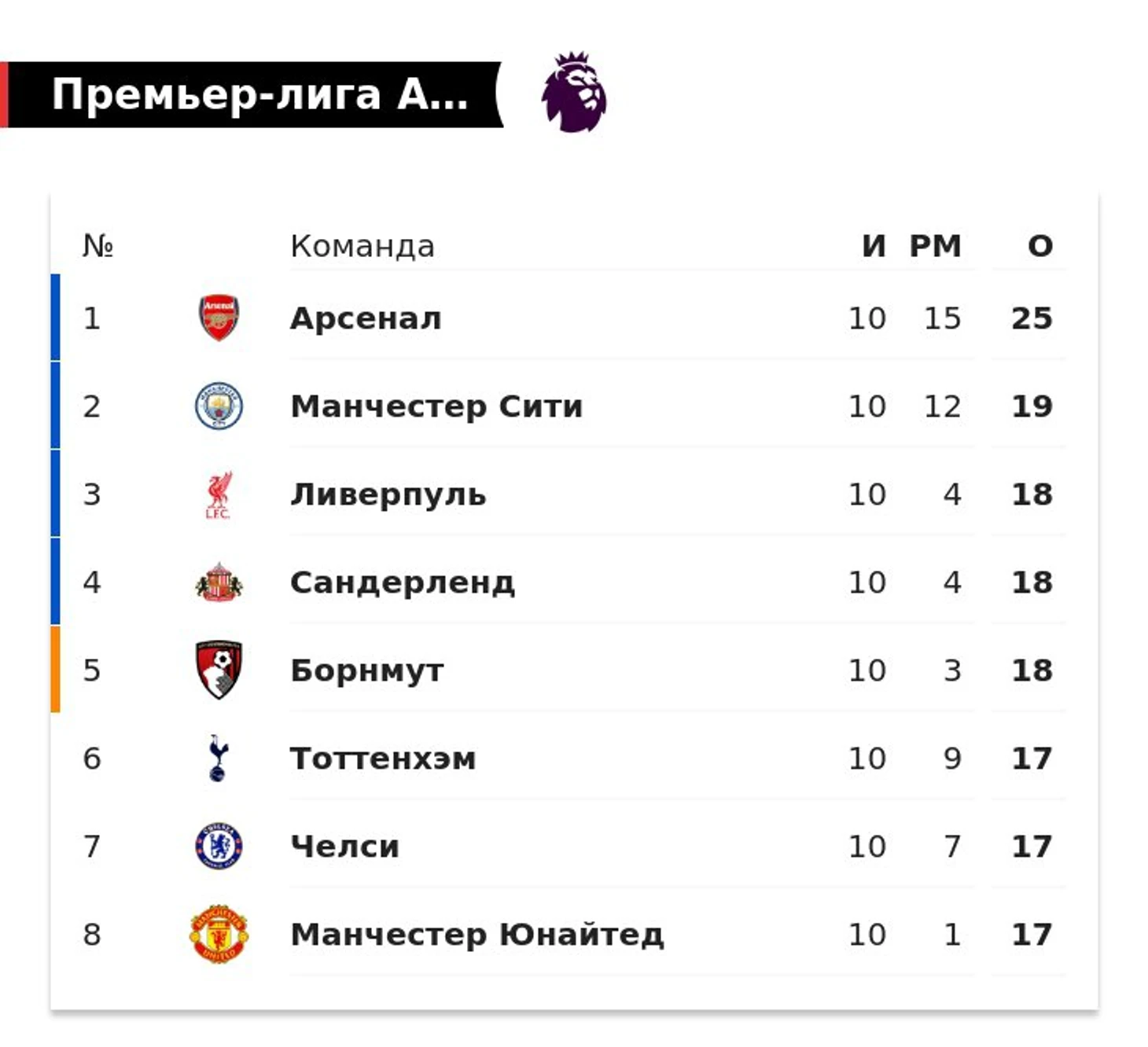 Klub hisobida 18 ochko bor - uchinchi o‘rinda borayotgan "Liverpul" va 5-o‘rindagi "Bornmut"da ham shuncha ochko bor. Ularning barchasi peshqadam "Arsenal"dan (25) 7 ochko ortda qolmoqda.