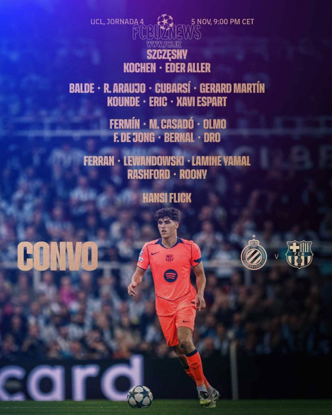 "Barselona"ning "Bryugge"ga qarshi o‘yin uchun qaydnomasi ma’lum (foto)