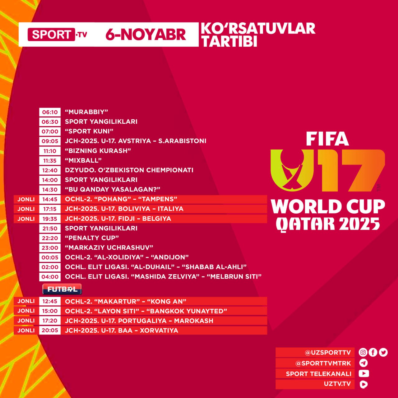 Sport va Futbol telekanallari bugun — 2025 yil 6-noyabr, payshanba kuni quyidagi ko‘rsatuv va translyasiyalarni efirga uzatishni rejalashtirgan.