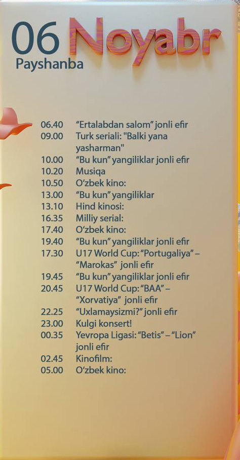 Zo'r TV telekanali bugun — 2025 yil 6-noyabr, chorshanba kuni quyidagi ko‘rsatuv va translyasiyalarni efirga uzatishni rejalashtirgan.