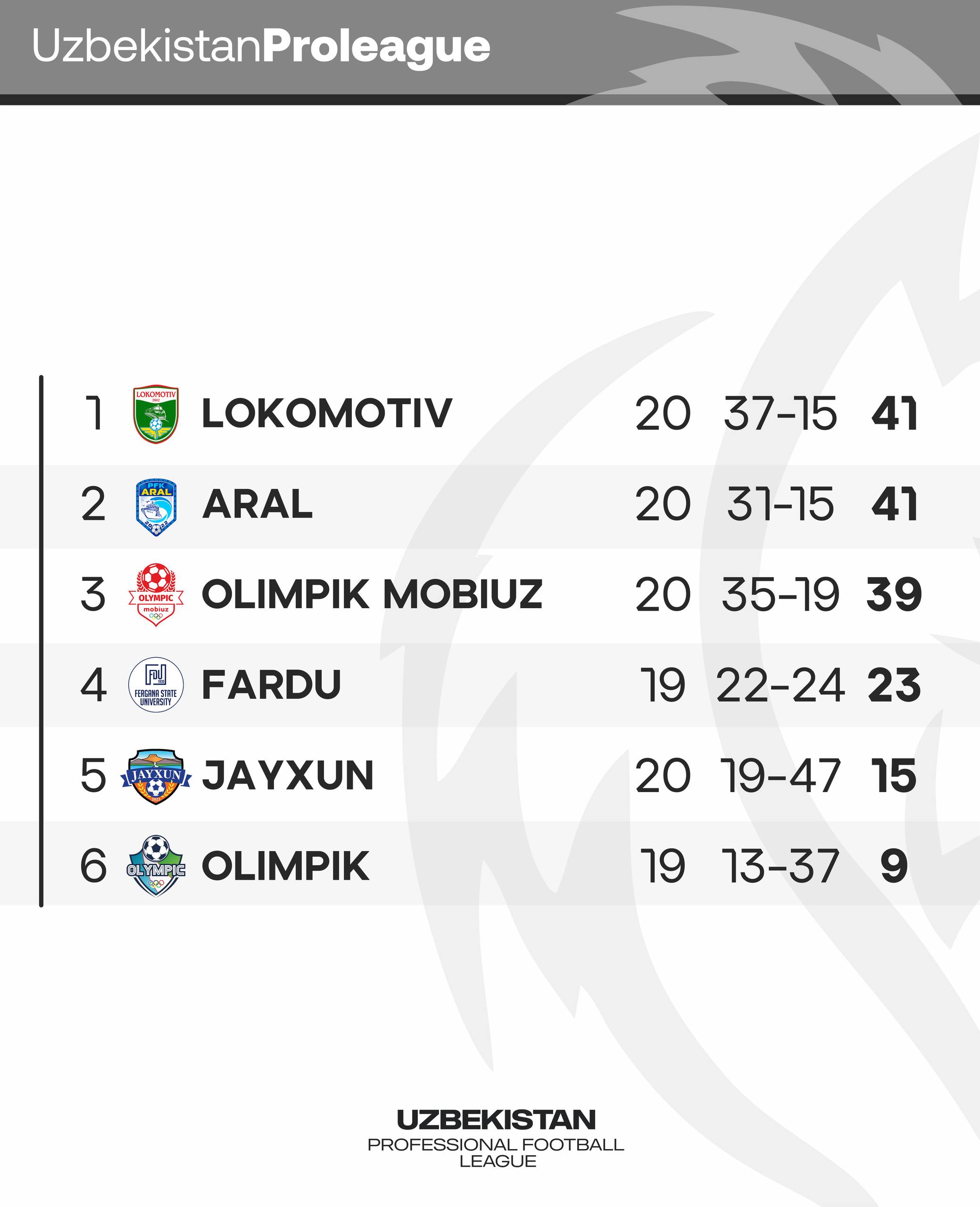 Mavsum yakuniga ko‘ra "Lokomotiv" va "Aral"da 20 o‘yindan so‘ng bir xil 41 ochkodan to‘plandi. "Temiryo‘lchilar" to‘plar farqidagi ustunlik sabab Superligaga to‘g‘ridan-to‘g‘ri qaytishdi. "Aral" pley-offda ishtirok etadi.