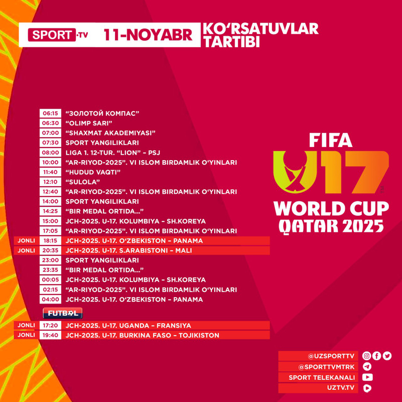 Sport va Futbol telekanallari bugun — 2025 yil 11-noyabr, seshanba kuni quyidagi ko‘rsatuv va translyasiyalarni efirga uzatishni rejalashtirgan.