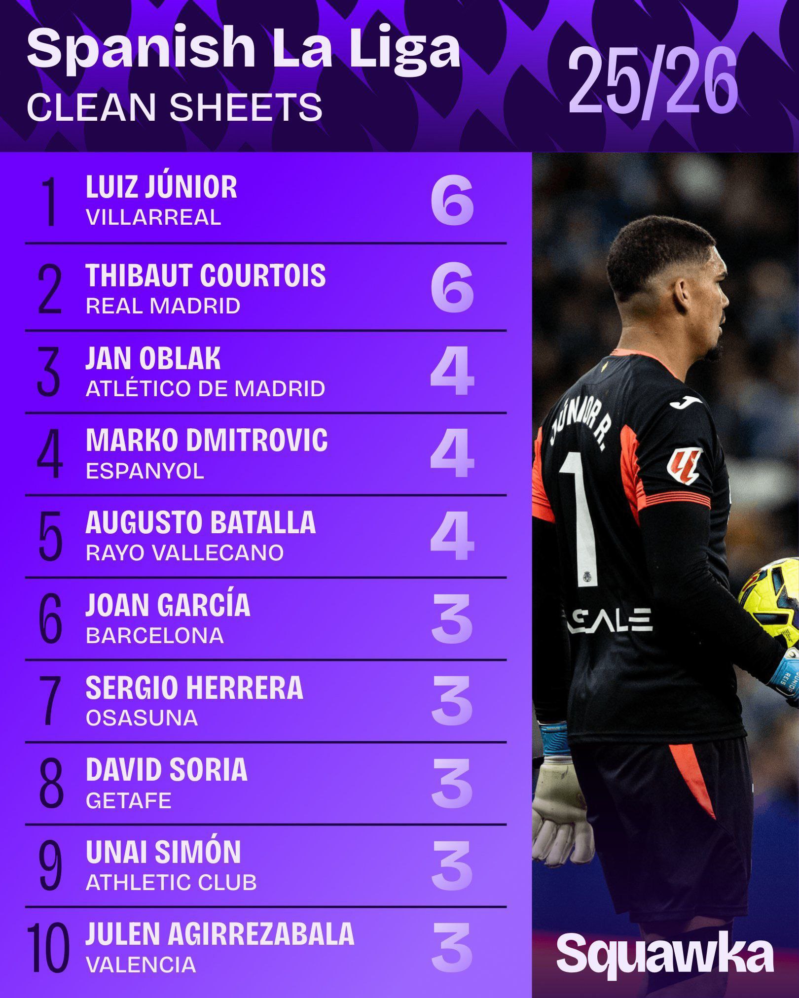 "Vilyarreal"dan Luis Junior va "Real"dan Tibo Kurtua La Liga joriy mavsumida eng ko‘p quruq o‘yin o‘tkazgan darvozabonlar bo‘lib turibdi. Ular ortda qolgan 12 ta turda 6 martadan darvozasi daxlsizligini saqlab qolishgan.