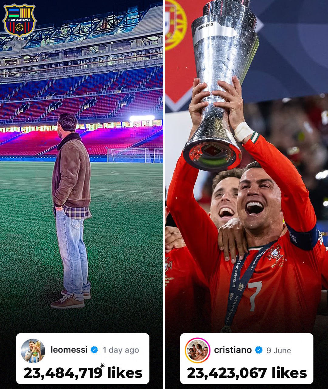 O‘sha rasm 2 kun ichida 23, 484,719dan oshiq "Like" to‘pladi. Taqqoslash uchun Ronalduning 4 yil avvalgi Millatlar ligasi kubogi bilan tushgan surati 23,423,067'dan ortiq "Like" yiqqan.
