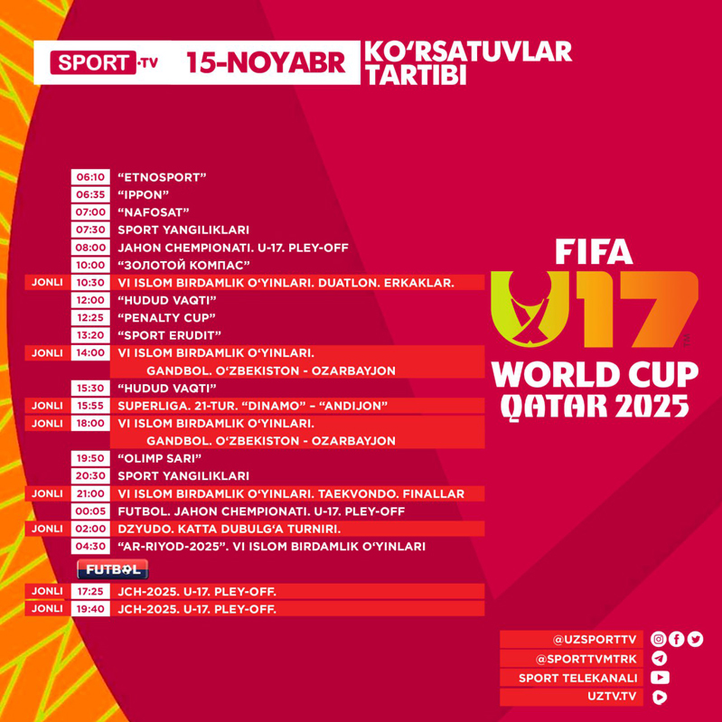 Sport va Futbol telekanallari bugun — 2025 yil 15-noyabr, shanba kuni quyidagi ko‘rsatuv va translyasiyalarni efirga uzatishni rejalashtirgan.