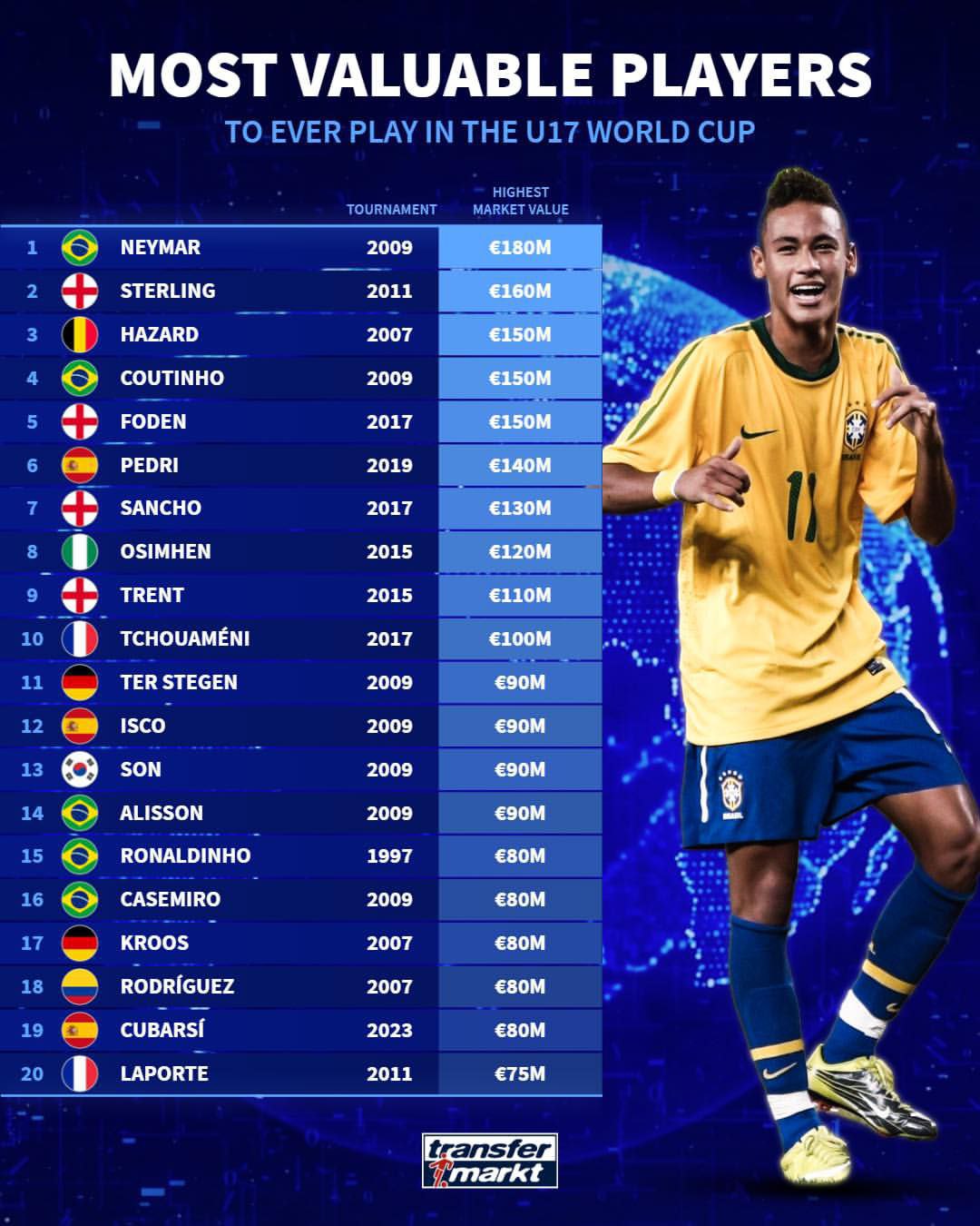 Transfermarkt U-17 JCH tarixida maydonga tushgan eng qimmat futbolchilar reytingini tuzdi