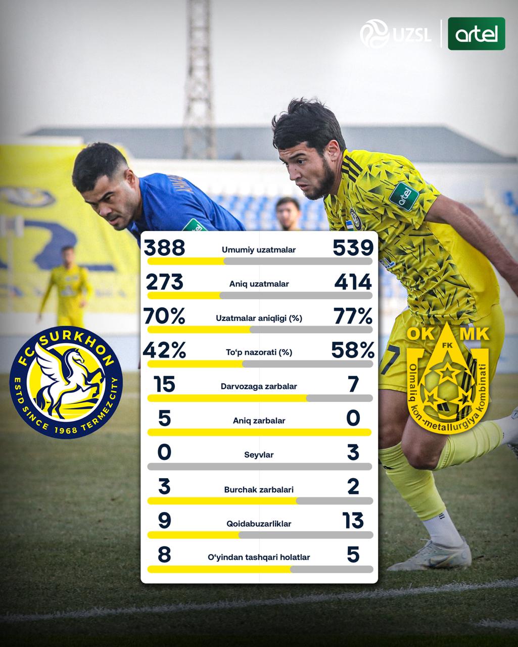 Superliga 29-turidan o‘rin olgan "Surxon" - OKMK uchrashuvi statistikasi va videosharhini tomosha qiling.