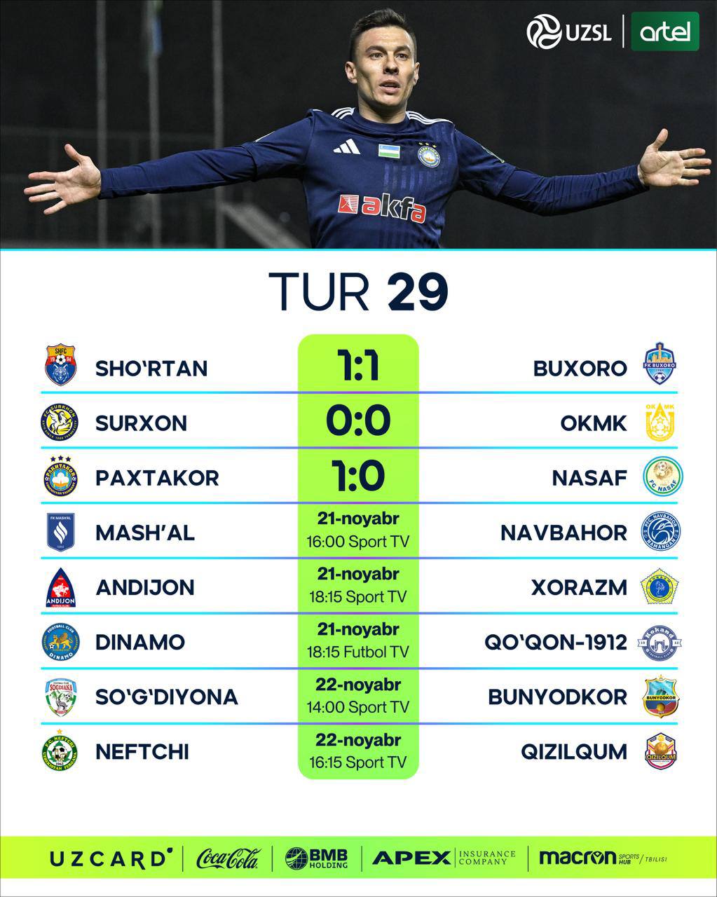 Superligada bugun 29-turning 3 ta o‘yini o‘tkaziladi.
