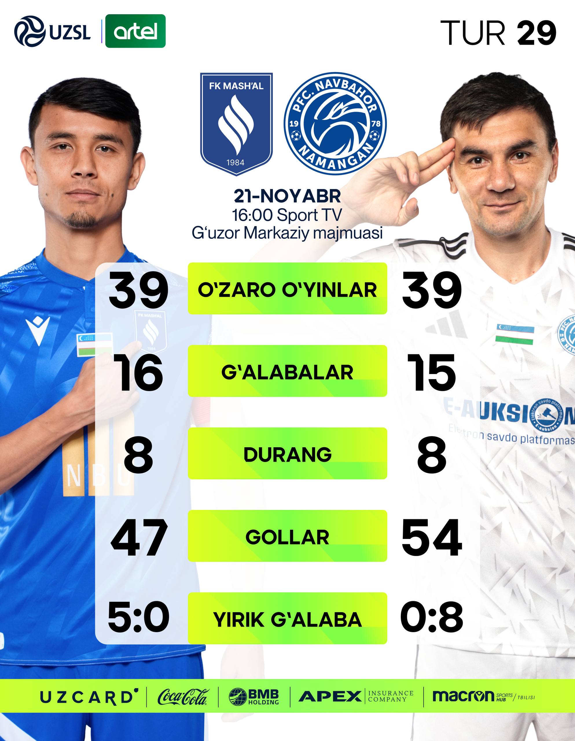 Superliga 29-turida "Mash’al" bugun o‘z maydonida "Navbahor"ni qabul qiladi.