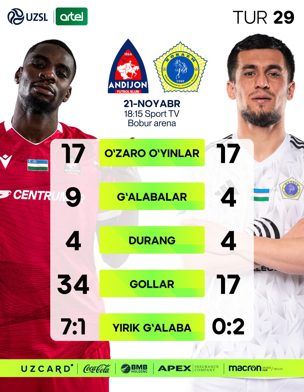 Superliga 29-turida "Andijon" bugun o‘z maydonida "Xorazm"ni qabul qiladi.