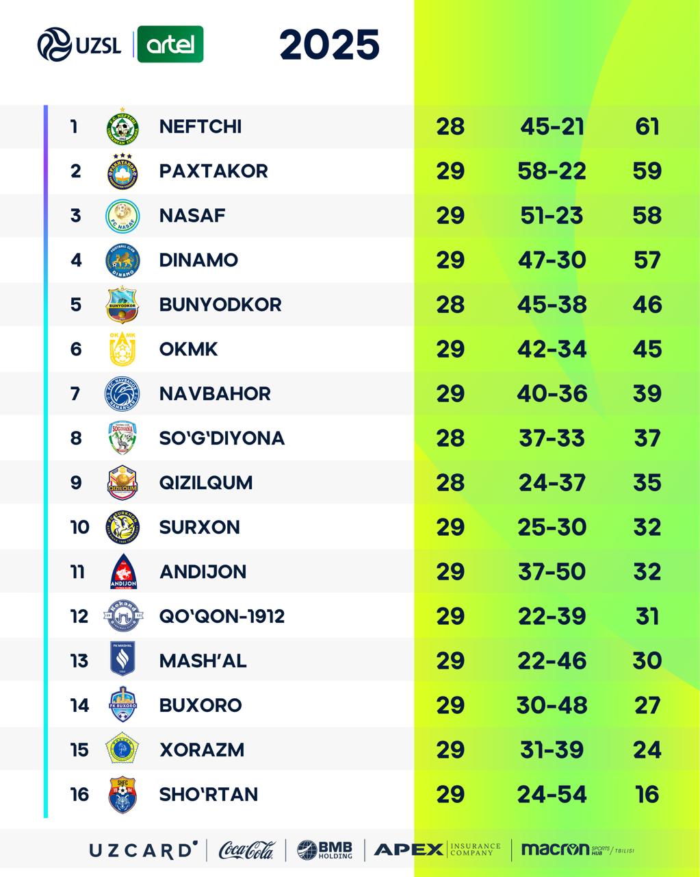 Superliga. 29-turning navbatdagi 3 o‘yinidan so‘ng turnir jadvalidagi holat bilan tanishing (foto)