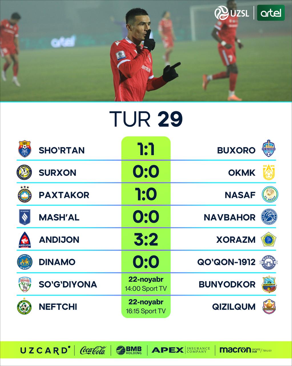 Superligada bugun, 21 noyabr kuni 29-turning uch o‘yini o‘tkazildi.