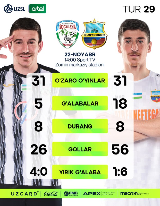 Superliga. "So‘g‘diyona" - "Bunyodkor". O‘zaro o‘yinlarda ustunlik qaysi jamoada?
