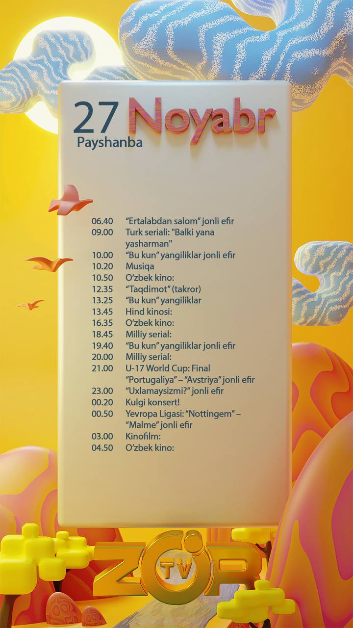 Zo'r TV telekanali bugun — 2025 yil 27-noyabr, payshanba kuni quyidagi ko‘rsatuv va translyasiyalarni efirga uzatishni rejalashtirgan.