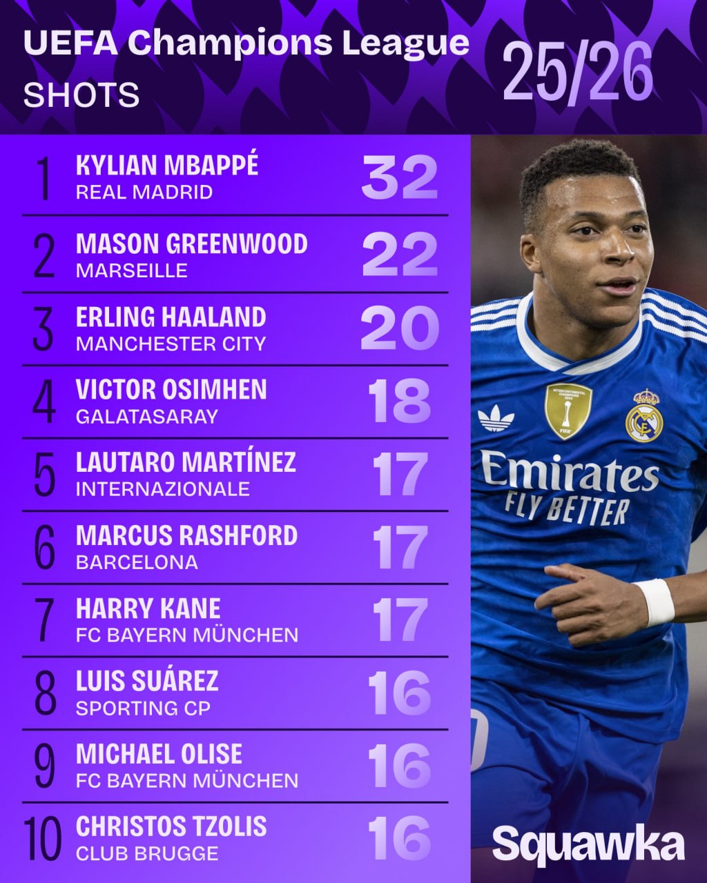 Madridning "Real" klubi hujumchisi Kilian Mbappe Chempionlar Ligasi joriy mavsumida raqib darvozasiga eng ko‘p zarba bergan futbolchi bo‘lib turibdi.