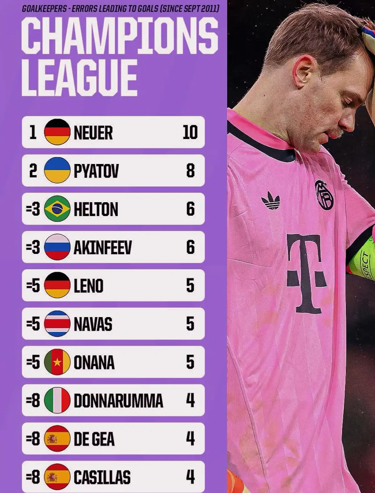 Noyer Chempionlar Ligasida golli xatolar bo‘yicha sharmandali rekordni yangiladi