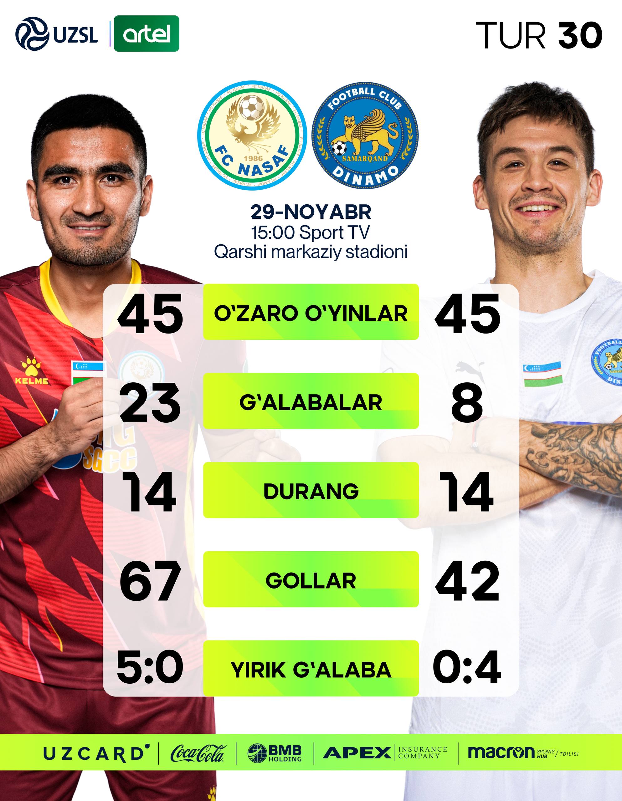 Superliga 30-turida "Nasaf" o‘z maydonida "Dinamo"ni qabul qiladi.