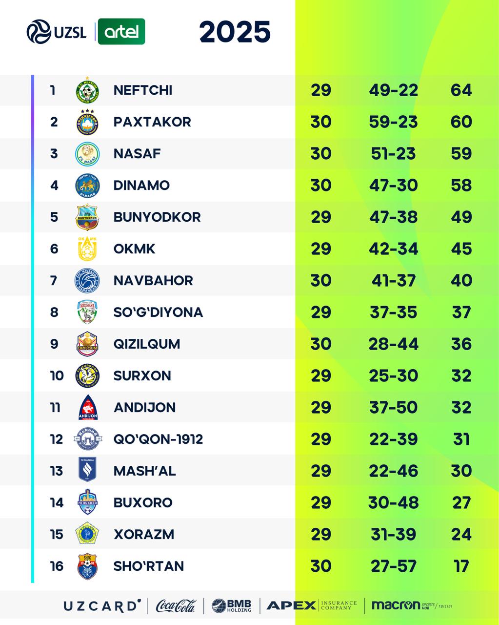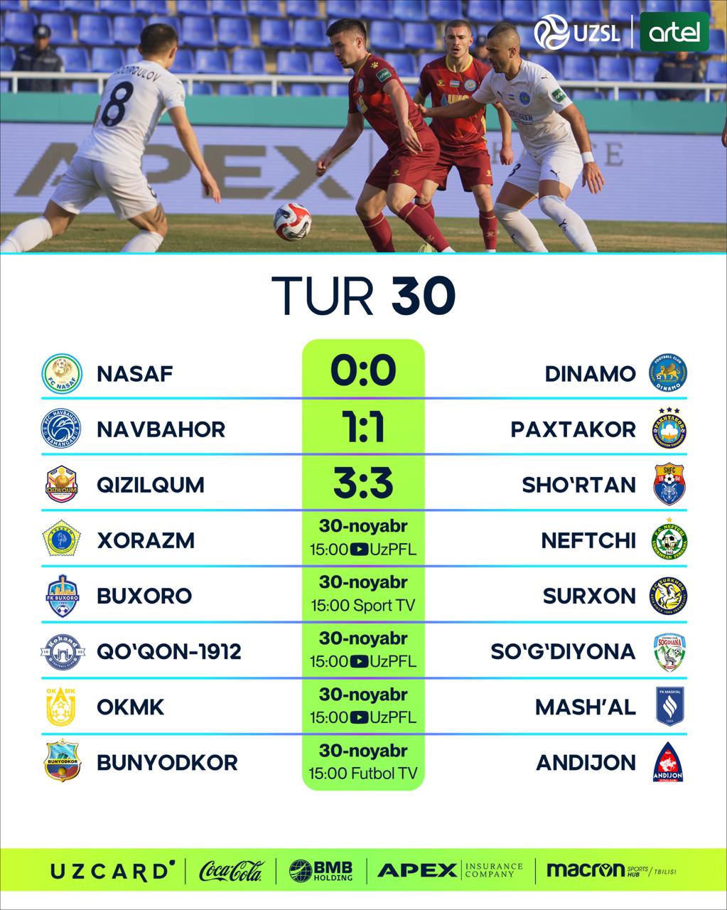 Superligada bugun, 29 noyabr kuni 30-turning 3 ta o‘yini o‘tkazildi.