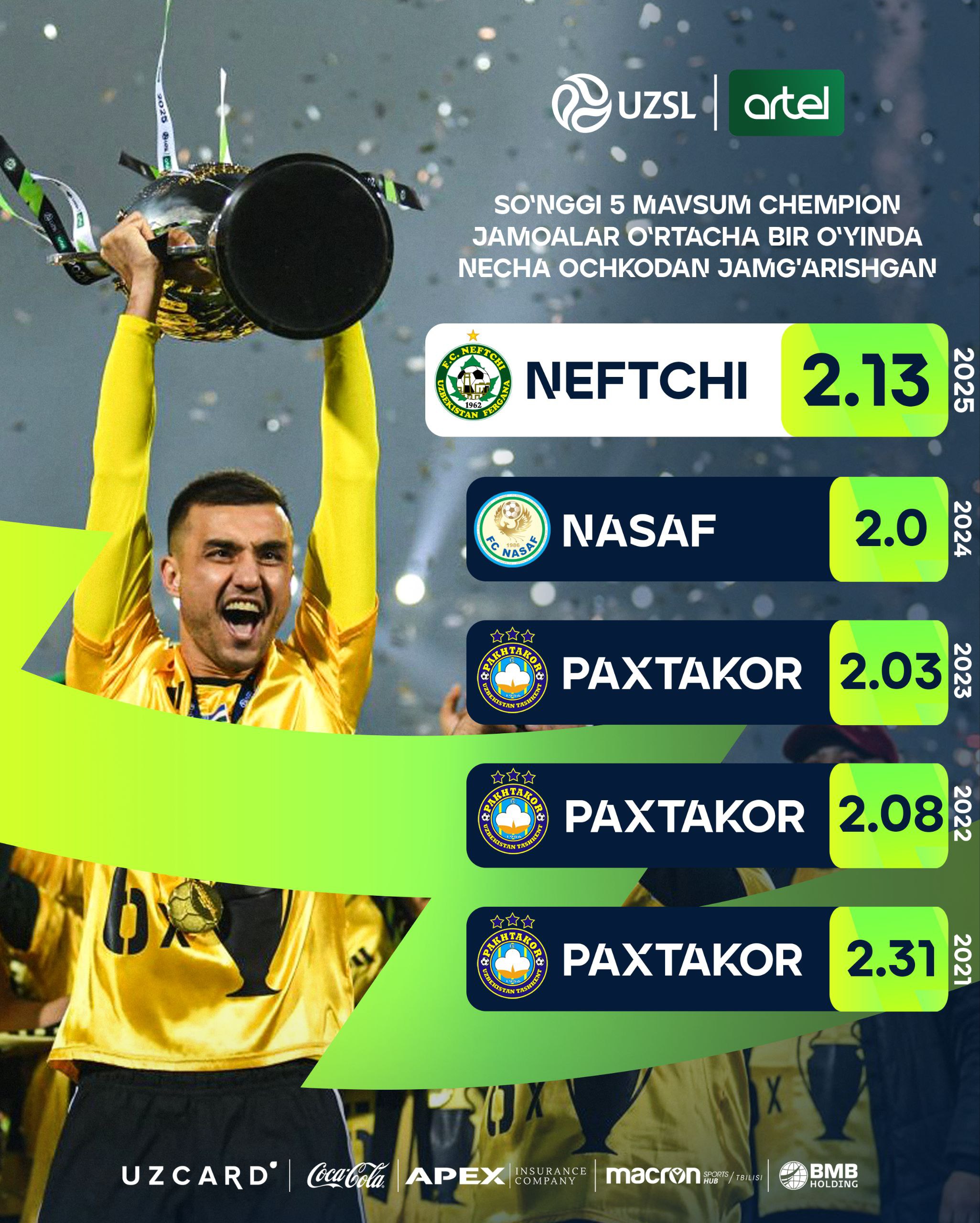 O‘zPFL so‘nggi 5 yilda O‘zbekiston Superligasi chempionlari o‘rtacha bitta o‘yinda necha ochkodan jamg‘arishgani haqida statistik ma’lumot e’lon qildi.