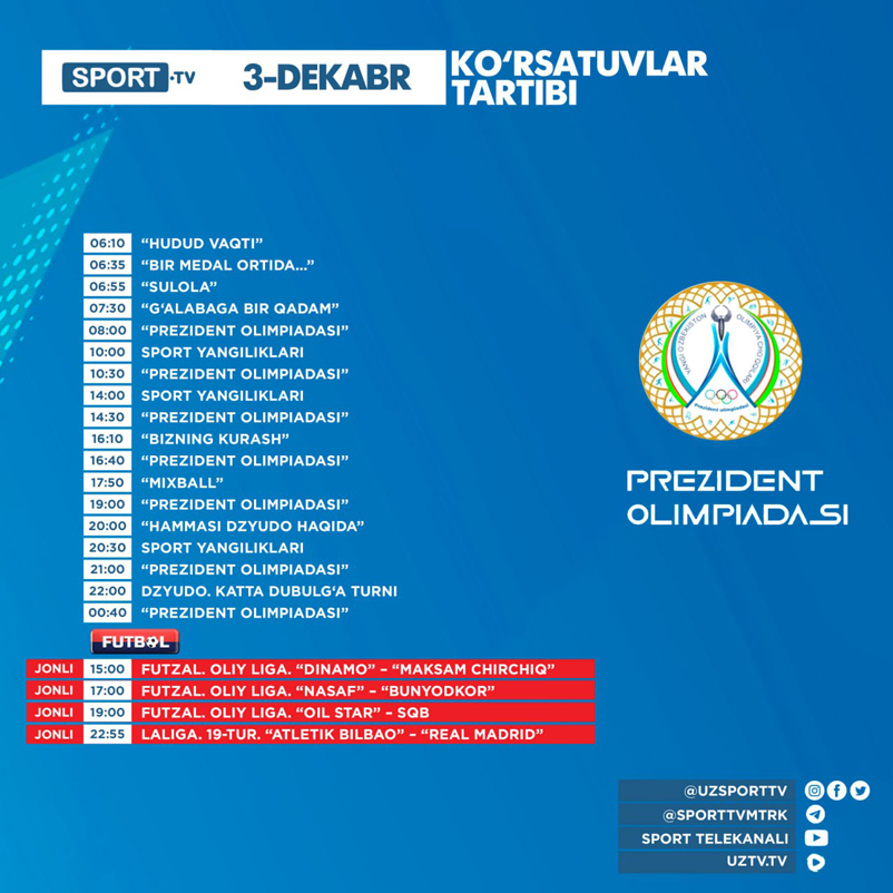 Sport va Futbol telekanallari bugun — 2025 yil 3-dekabr, chorshanba kuni quyidagi ko‘rsatuv va translyasiyalarni efirga uzatishni rejalashtirgan.