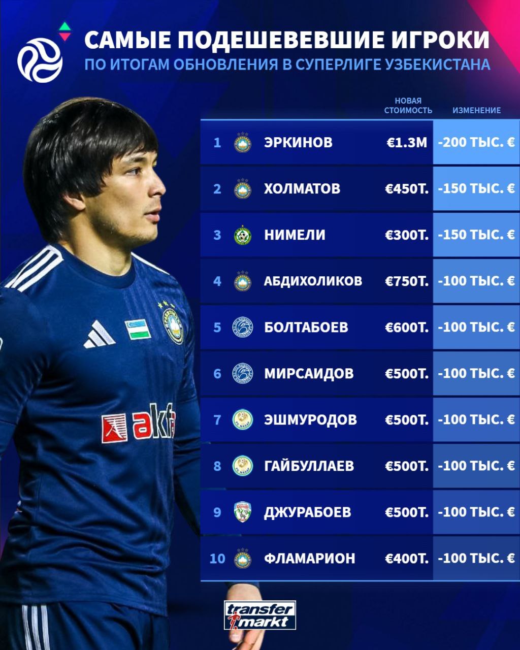 Superligada narxi eng ko‘p pastlagan futbolchilar ro‘yxati (TOP-10)